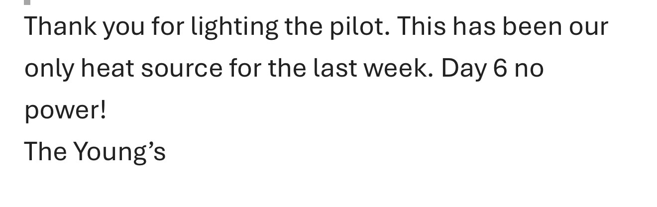 Our accounting team Lisa and Julie jumped in answering over 300 phone calls every day starting on Friday, January 23, 2026 with everyone calling for backup heat and trying to help with information about lighting a pilot light for gas logs.