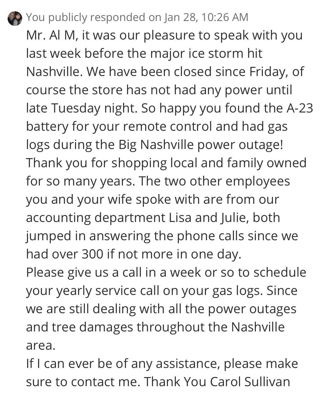 I believe the last week in January 2026 will go down in our history books as the worst winter ice storm to ever hit Nashville and surrounding counties. Our store had NO power from January 24, 2026 until late Tuesday night on January 27, 2026. We finally were able to reopen on Wednesday, January 28, 2026 with a limited staff.