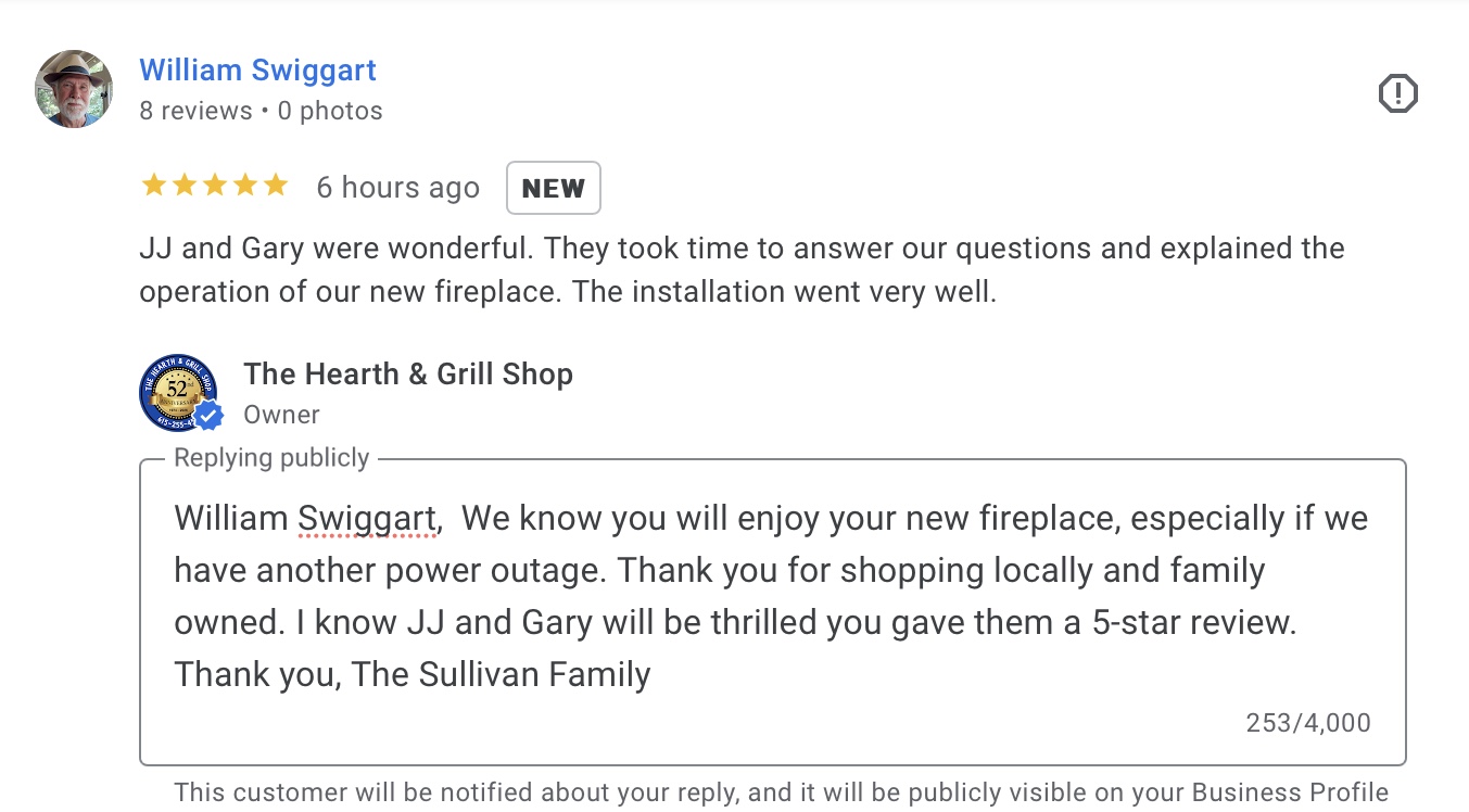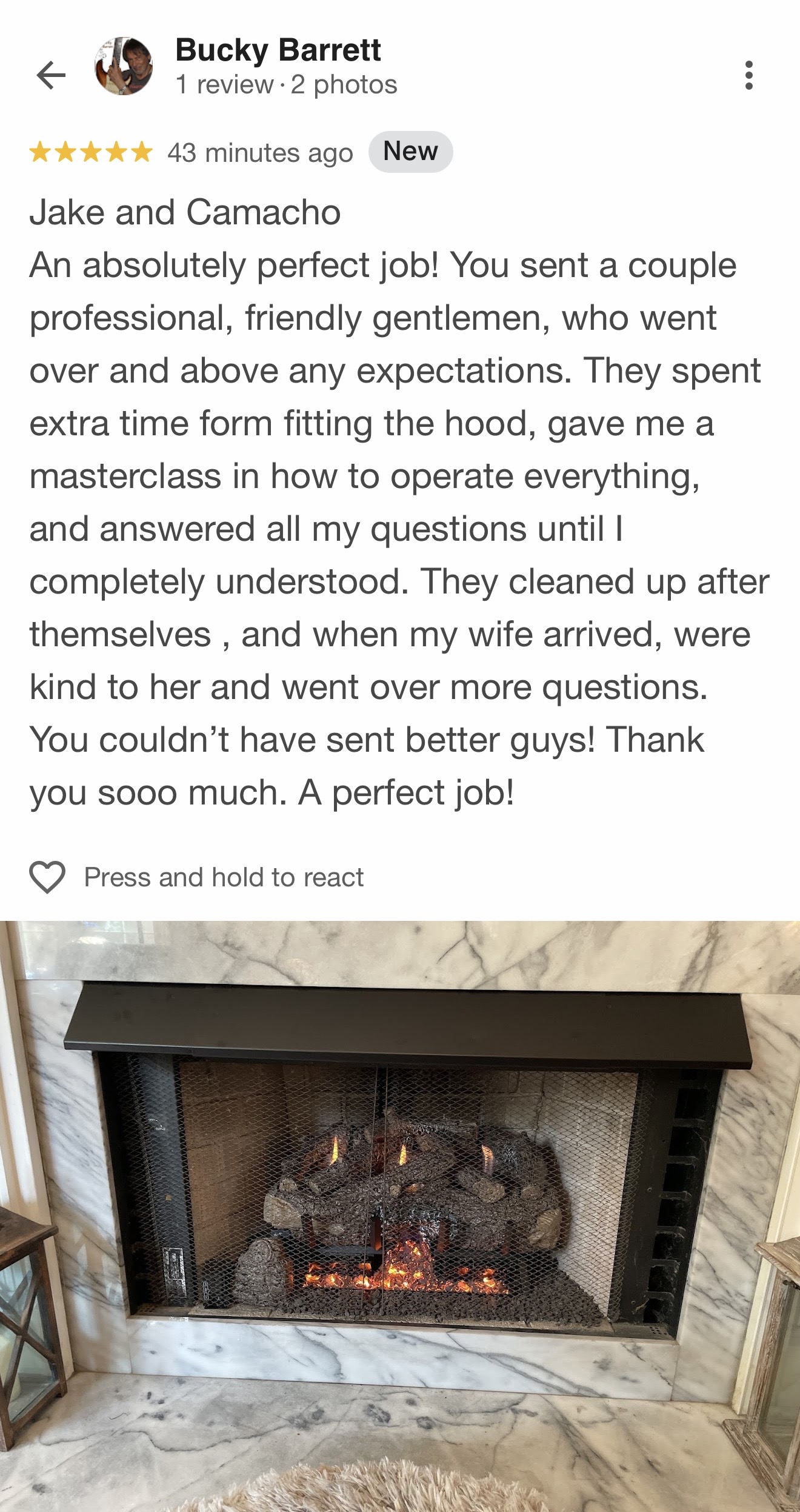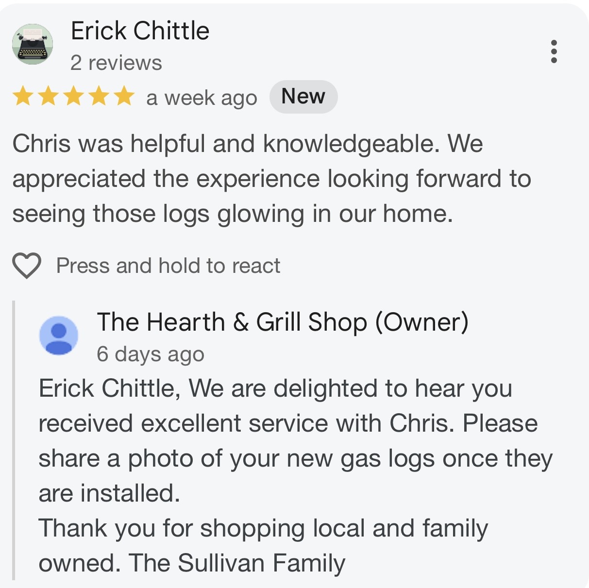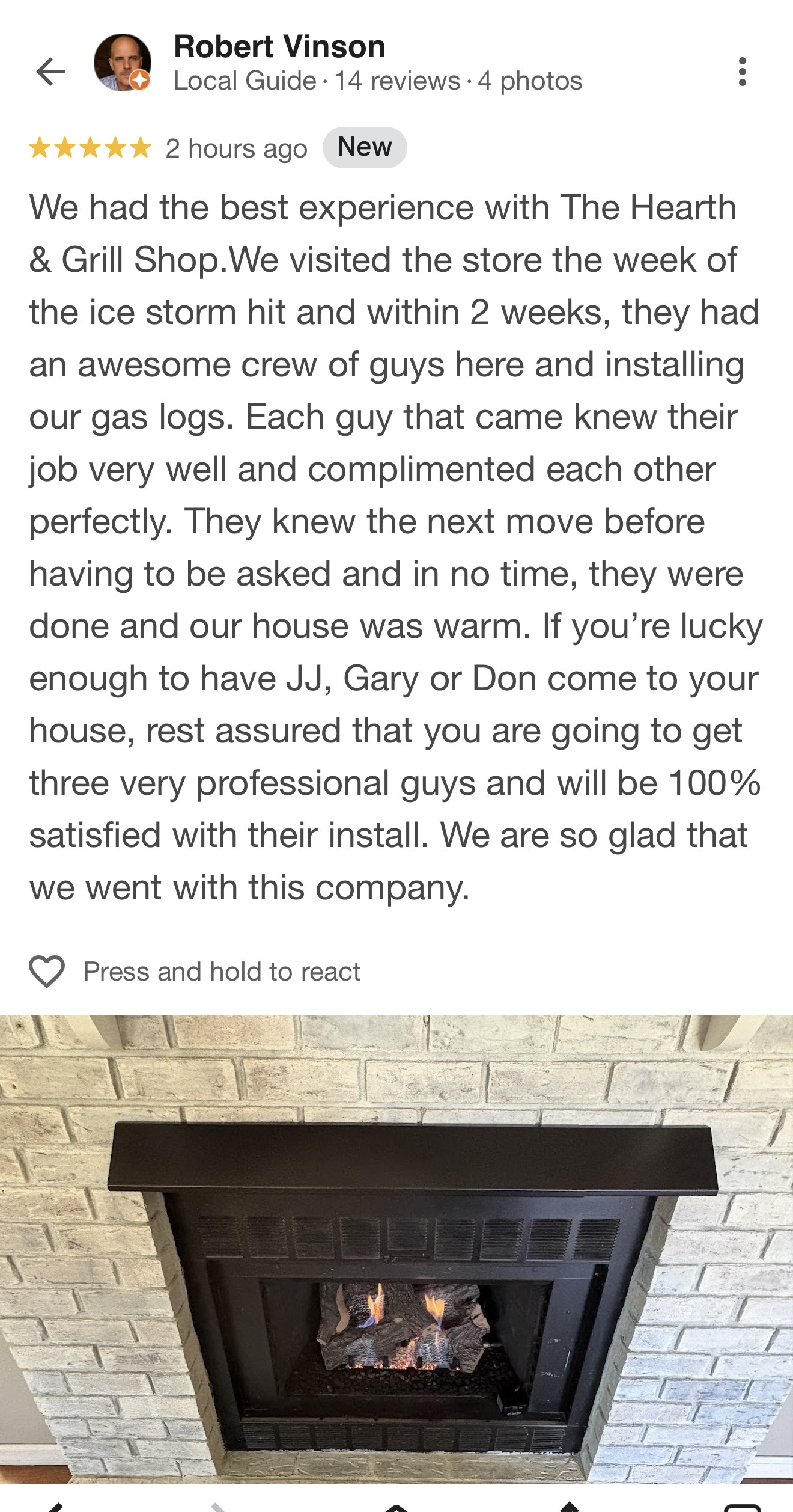 Below is a photo taken by Mr. Vinson of his new Sassafras Vent Free gas logs. Thank you for sharing your experience with one of our installation teams. JJ, Gary, and Don were so happy to hear your were pleased with the installation of your new gas logs.
