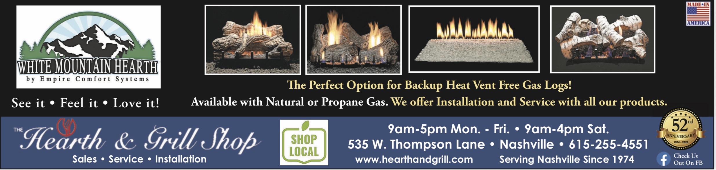 When you’re traveling down West Thompson Lane in Nashville just pass the Railroad Tunnel, stop in to see our wide selection of gas logs and accessories. And in April we start bringing the new grills and smokers to kickoff springtime.