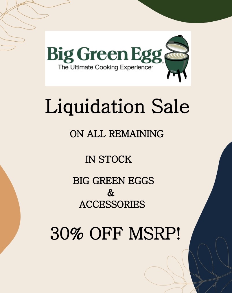 Liquidation Sale on all remaining in stock Big Green Egg Smokers and accessories. We offer Free Assembly, Free Local Delivery and Free Haul away of your old grill with proper disposal.
