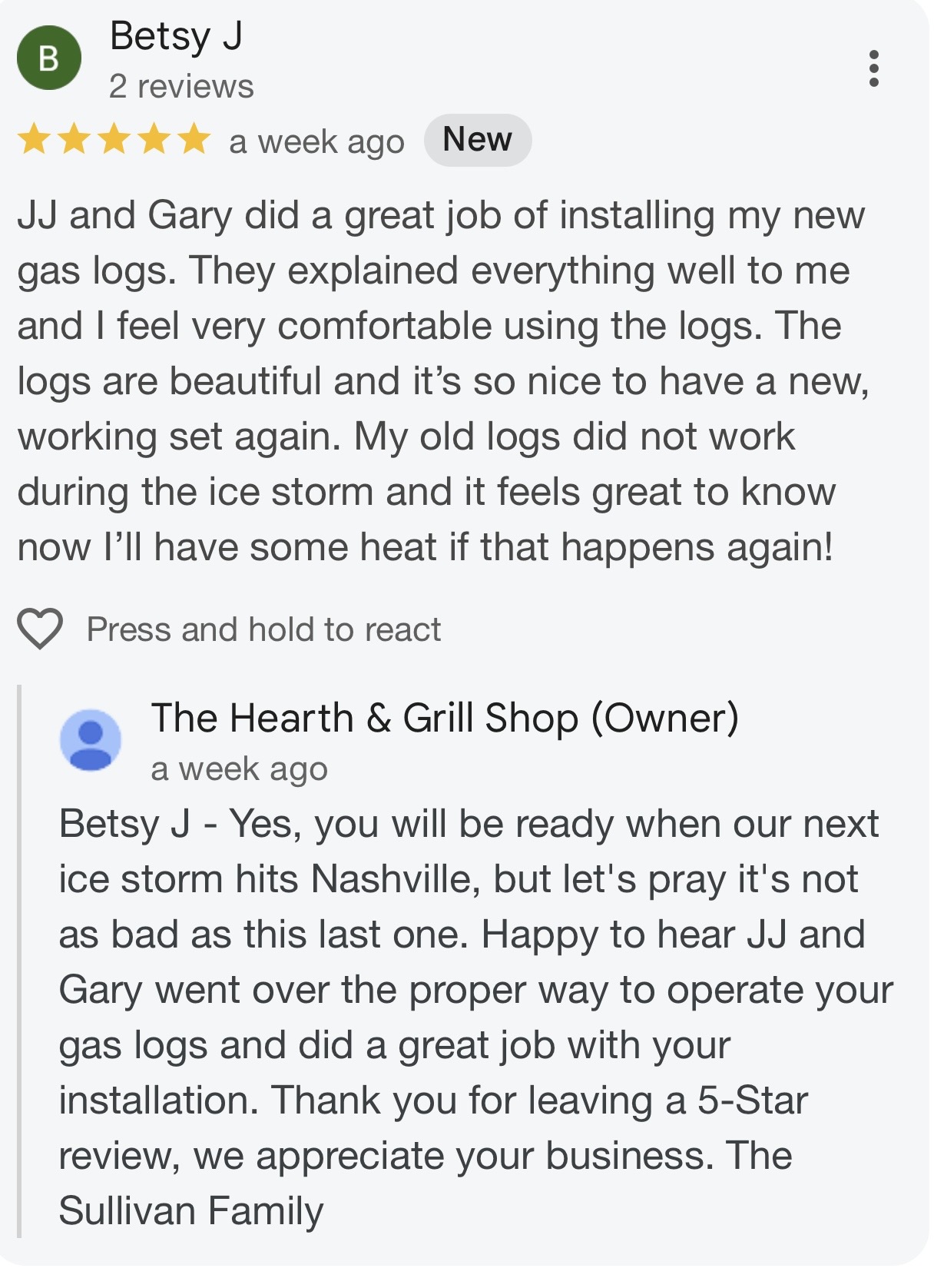 For their installation and spending time explaining the proper way to operate their new Gas Logs or Grills.