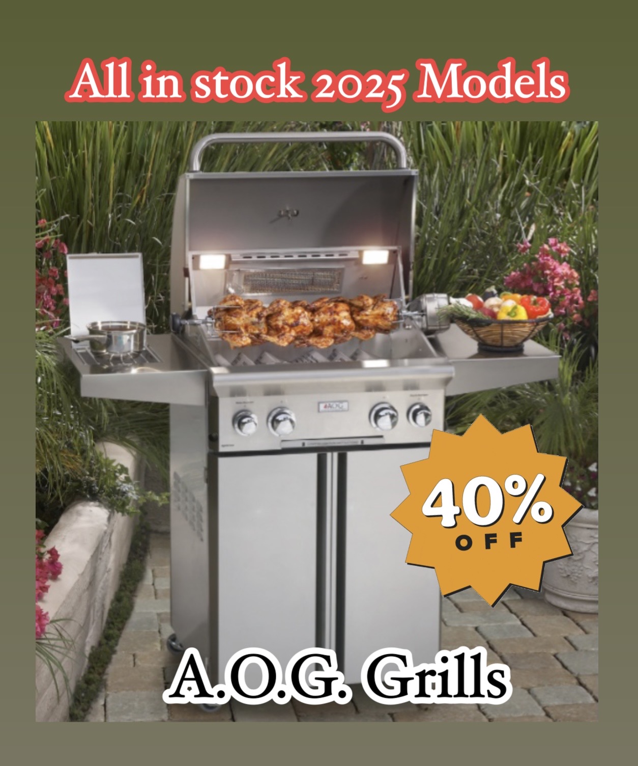 So we are selling all in stock 2025 AOG grills at a huge discount of 40% Off MSRP.